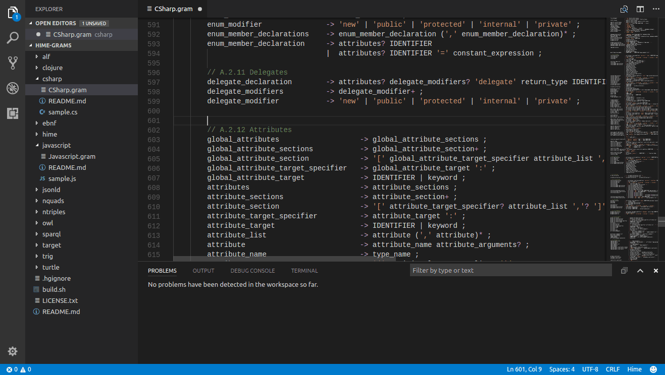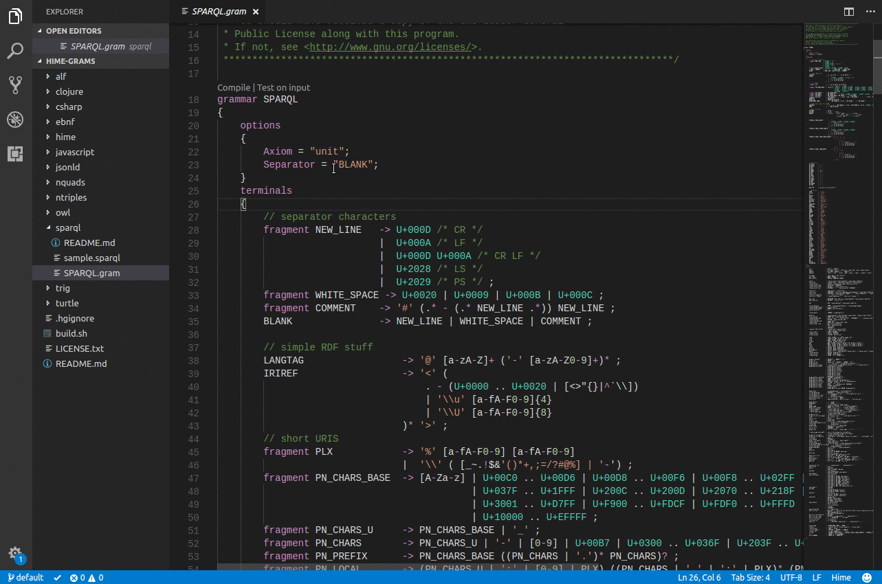 Complete support for the edition of Hime grammars is available in Visual Studio Code with the Hime Language Support extention. To install this extension, open up VS Code, hit F1, type ext, select Install Extension, type hime-language, hit enter and reload window to enable. The extension can also be downloaded here and manually installed.